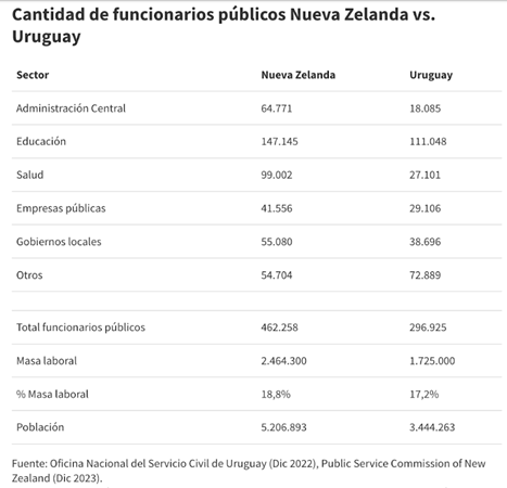 Tomando en cuenta estos factores, se concluye que Uruguay y Nueva Zelanda tienen una proporción de funcionarios públicos similar.