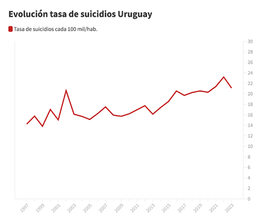 Según datos preliminares, el Ministerio de Salud Pública (MSP) anunció que en 2023 hubo un 8 % menos de suicidios que el año anterior. Según una nota de La Diaria del 11 de abril de 2024: