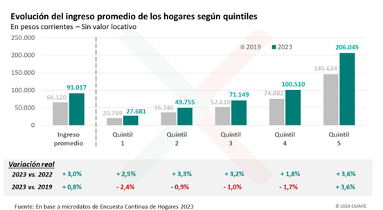 ¿A qué se refiere con ‘Ingreso promedio’ en el gráfico de más a la izquierda? ¿Cómo fueron los ingresos promedio en el año 2023 comparado con los ingresos promedio en el año 2019? ¿Y comparado con el año 2022?