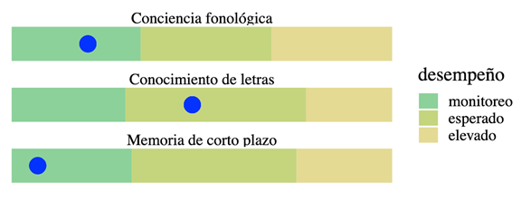 El nivel de zona de monitoreo marca el rango de valores obtenido por el 30% de los niños y niñas con desempeño más descendido. El nivel de desempeño esperado marca el rango de valores obtenidos por el 50% de los niños y niñas. El nivel elevado marca el rango de valores obtenidos por el 20% de los niños y niñas con desempeño más elevado. El punto azul marca el puntaje obtenido por 2eb2a023-482d-4 en las tres dimensiones evaluadas.