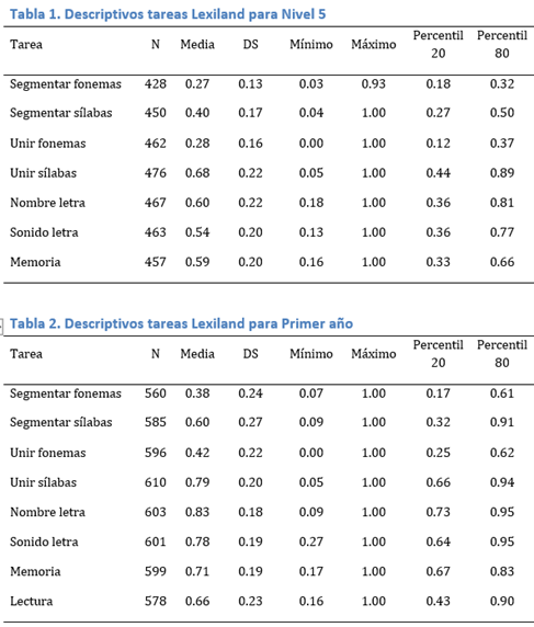 Las siguientes tablas muestran los estadísticos descriptivos correspondientes a las distintas tareas de Lexiland, aplicadas a niños que cursaban Nivel 5, en el primer caso, y Primer año en el segundo. La muestra estuvo compuesta por 1111 alumnos de centros educativos de los cinco quintiles socioeconómicos (categorización de ANEP), ubicados en los departamentos de Montevideo, Canelones, Salto, San José, Colonia y Soriano.