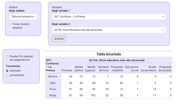 Ejemplo de pregunta: Entre las personas que tienen mucha confianza en la prensa ¿Cuántas alcanzaron el nivel de Posgrado-Doctorado?