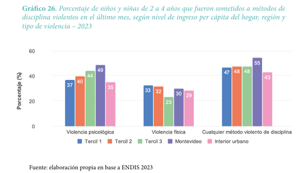 El siguiente gráfico forma parte de un informe del MIDES basado en la Encuesta de Nutrición Desarrollo Infantil y Salud (ENDIS) 2023, y representa la prevalencia de métodos de disciplina violentos, según características del hogar.