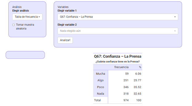 Elegir análisis > Tabla de frecuencias univariada > Elegir variable 1 (Confianza en la prensa) Puedes observar las frecuencias absolutas