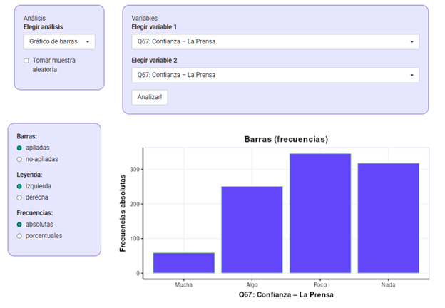 Elegir análisis > Gráfico de barras > Elegir variable 1: Confianza en la Prensa, variable 2: Nivel educativo > Barras: apiladas > Frecuencias: porcentuales