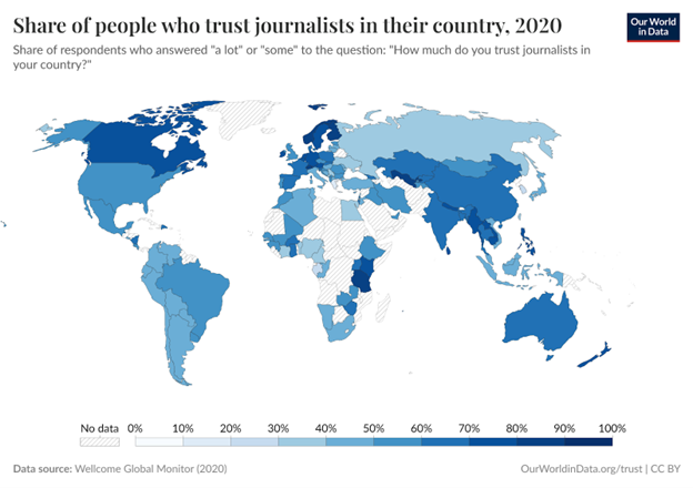 Porcentaje de personas que confían en los periodistas en su país, 2020