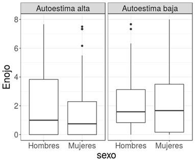 Para personas con valores de autoestima alta, hay mayor variabilidad en los niveles de enojo en los hombres que en las mujeres. El patrón es inverso para valores de autoestima bajos.