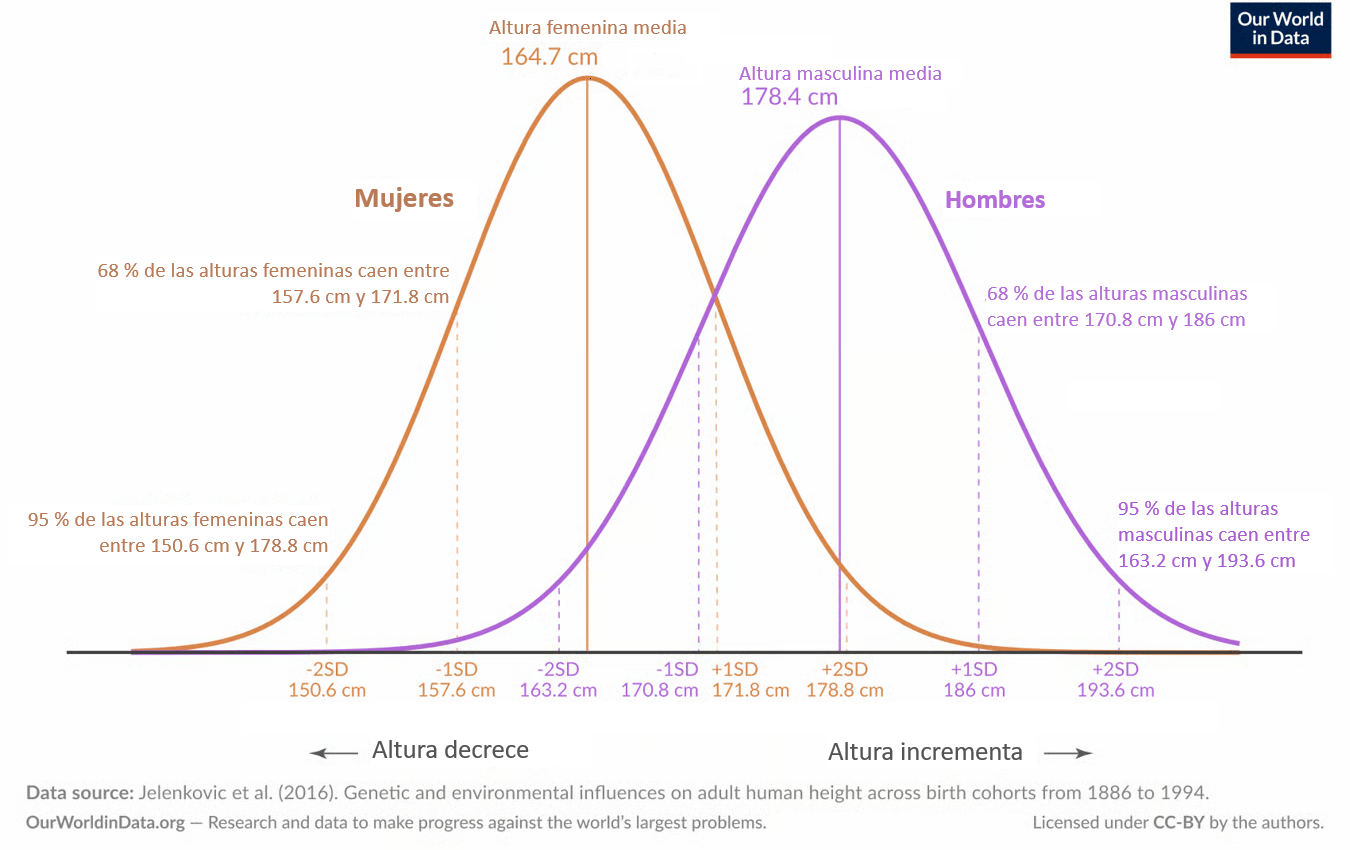 La altura humana está afectada por una serie de factores genéticos y ambientales que dan lugar a su variabilidad en la población. No obstante, al igual que otros fenómenos de la naturaleza y rasgos en la psicología, a nivel poblacional la altura se distribuye siguiendo una curva normal. Pero ¿Qué implicancias tiene saber que la distribución es normal? Si conocemos la media y la desviación estándar de las alturas podemos tener una buena comprensión de la forma en que se distribuye esa característica, fenómeno o rasgo en una determinada población.